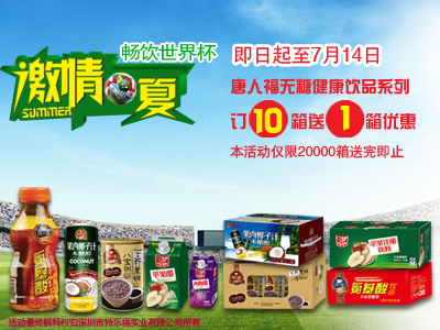 關(guān)鍵詞:驚喜優(yōu)惠 邀您暢飲激情世界杯 2014年世界杯熱浪滾滾來襲,無論老少都無法躲避世界杯的熱潮。唐人福無糖食品為新老客戶準(zhǔn)備一場“激情夏日,暢飲無糖飲料季”盛宴。 即日起至2014年7月14日,唐人福無糖健康飲品系列訂10箱送一箱,本活動僅限20000箱,送完為止。